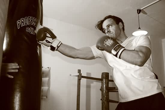 Durch die optimale intramuskuläre Koordination holt man alles an Kraft aus seinem Körper heraus. Vor allem der Einsatz der großen Beinmuskeln lohnt, sich. Übung: Schlagtraining am Boxsack.